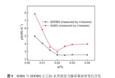 圖5 SDBS與SDDBS正己烷-水界面張力隨質(zhì)量濃度變化曲線