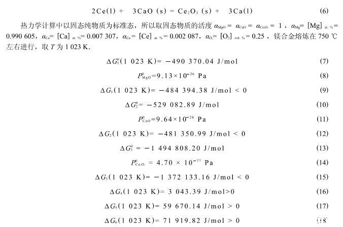 但由于Ce元素在合金熔體中是分布不均勻的,如圖6所示的點能譜分析可以看出,Ca和Ce在此處的相對原子分數(shù)分別達到了2.50%和3.34%.按照此處的原子活度計算得到:Delta G_4(1023~K)=-12885.19~kJ/mol<0,Delta G_5(1023~K)=17418.58~kJ/mol>0,Delta G_6(1023~K)=56138.14~kJ/mol>0,在此處式(4)中的反應(yīng)可以自發(fā)地進行.由此可知,式(4)、(5)、(6)的反應(yīng)在局部元素分布不均勻的區(qū)域有可能發(fā)生置換反應(yīng).