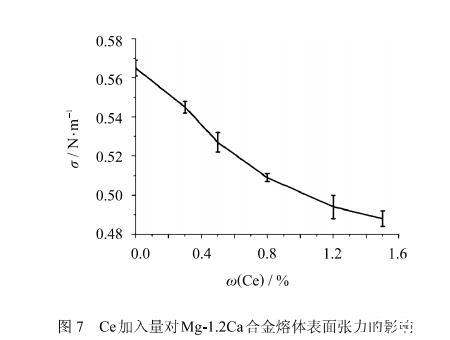 稀土元素Ce是表面活性元素,很容易富集到鎂合金熔體表面,這種表面富集現(xiàn)象極大地影響了鎂合金熔體氧化膜結(jié)構(gòu)及其阻燃性能.表面張力是一個重要的高溫熔體物理屬性,可以很好地反映Ce元素在阻燃鎂合金熔體表面的富集狀況,從而為研究阻燃鎂合金機理提供了另外一種直觀的理論依據(jù).