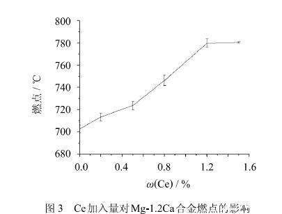 1)在一定范圍內(nèi),隨著Ce含量的增加,合金的燃點也隨之提高,當Ce含量達到1.2%時,合金的燃點能達到780℃。