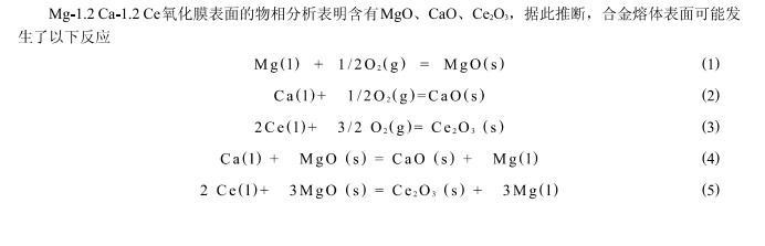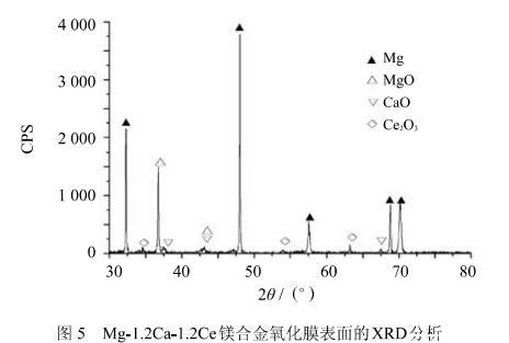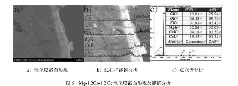 4)通過氧化膜的截面檢測和熱力學計算分析得出Mg-1.2Ca-1.2Ce的形成的氧化膜大致分為3層:外層是MgO,中間層是CaO,內(nèi)層是Ce2O3。
