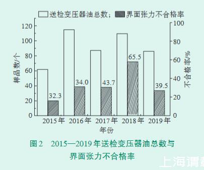 2015—2019年送檢變壓器油總數(shù)與界面張力不合格率如圖2所示,不合格率均高于30%,其中2018年高達(dá)65.5%。