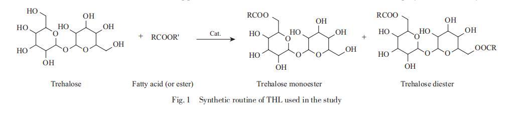 海藻糖脂(THL)是一種含有海藻糖親水部分的糖脂,可以降低界面張力并增加疏水化合物的假溶解度。海藻糖脂具有多樣的結(jié)構(gòu)特征,并已用于各種工業(yè)應(yīng)用,例如農(nóng)業(yè)中的生物農(nóng)藥,以及食品工業(yè)中的乳化劑和防腐劑。海藻糖脂在清潔、乳化、發(fā)泡、抗菌活性方面的多功能特性,使其在化妝品中具有多種應(yīng)用潛力。作為糖脂表面活性劑,海藻糖脂由多種微生物產(chǎn)生,其疏水區(qū)域表現(xiàn)出從短鏈到長(zhǎng)鏈和復(fù)雜脂肪酸鏈的多種結(jié)構(gòu)。生物合成產(chǎn)率低是生物表面活性劑的常見(jiàn)問(wèn)題,這阻礙了其大規(guī)模生產(chǎn)。目前,通過(guò)化學(xué)合成制備的具有簡(jiǎn)單結(jié)構(gòu)的海藻糖脂是生產(chǎn)的更好選擇,本研究中使用的海藻糖脂的合成路線如圖1所示。本研究中使用的海藻糖脂由綠色原料(淀粉、棕櫚油等)通過(guò)脂肪酸酯和海藻糖之間的酯交換反應(yīng)制成,利用來(lái)自淀粉的葡萄糖和從棕櫚油提取中獲得的脂肪酸(酯)。