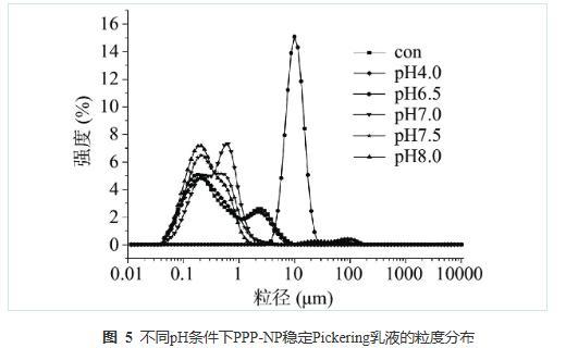 乳液在不同pH下的粒徑分布如圖5所示。大多數(shù)乳液呈現(xiàn)雙峰分布,但峰均不同。這可能是由于PPP-NP在油水界面上的重組和重排可能使液滴橋接,從而導(dǎo)致其呈雙峰分布。con與pH4.0的乳液的粒徑分布在較寬的范圍內(nèi)變化,而在中性及堿性條件下(pH7.0~8.0),乳液的液滴尺寸分布在小范圍內(nèi)相對(duì)均勻。乳液液滴粒徑分布范圍越窄、峰值越小表明乳液越穩(wěn)定;因此,堿性條件下制備的Pickering乳液相對(duì)穩(wěn)定。事實(shí)上,較多種類的蛋白質(zhì)在堿性條件下的熱變性和適度聚集均會(huì)導(dǎo)致其乳化性增強(qiáng),包括乳清分離蛋白、卵白蛋白等。而且,雖然pH6.5乳液的粒徑分布比較窄,但其峰值遠(yuǎn)遠(yuǎn)大于其余各組,與較大的液滴尺寸相對(duì)應(yīng)的乳液的峰面積可能是由于橋接機(jī)制形成的絮凝。因此可能導(dǎo)致pH6.5乳液的長(zhǎng)期穩(wěn)定性低于堿性條件下制備的Pickering乳液。