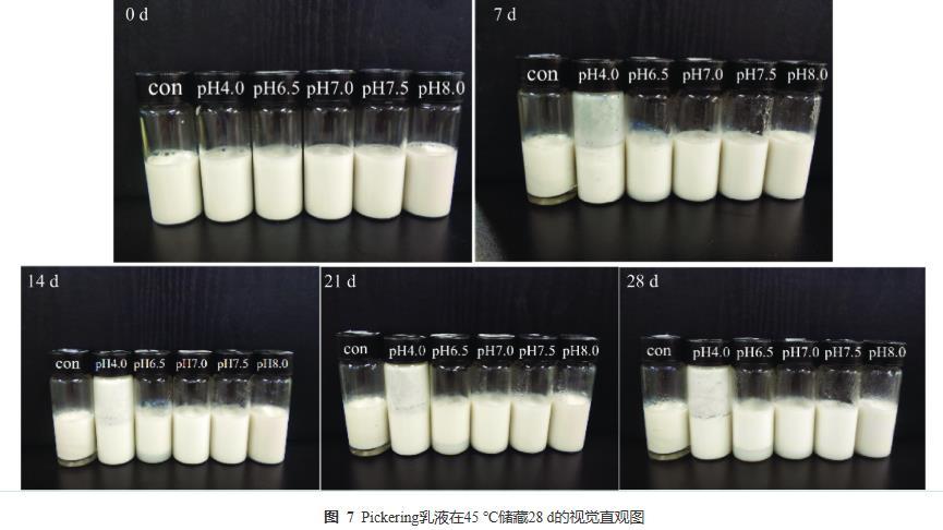 制備了不同pH下PPP-NP穩(wěn)定的水包油Pickering乳液,并在45℃下加速儲(chǔ)存28 d,每7 d進(jìn)行拍照記錄其視覺(jué)外觀的變化。乳液的視覺(jué)外觀監(jiān)測(cè)照片如圖7所示。con和pH4.0的乳液在加速儲(chǔ)藏7 d后發(fā)生分層和聚結(jié)等現(xiàn)象;pH6.5的乳液在第14 d時(shí)底部出現(xiàn)分層現(xiàn)象;pH7.0~8.0的乳液在儲(chǔ)藏28 d后仍保持良好的視覺(jué)外觀,未出現(xiàn)相分離、聚結(jié)等現(xiàn)象,在整個(gè)實(shí)驗(yàn)過(guò)程中均保持均勻穩(wěn)定。這些現(xiàn)象直觀地表明PPP-NP具有良好的乳化能力,且制備出的乳液具有較好的穩(wěn)定性,這可能與蛋白聚集體表面疏水性提高,從而有效降低其在油水界面上吸附所需的能量。