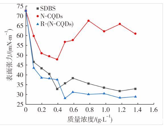 陰離子型表面活性劑十二烷基苯磺酸鈉(SDBS)是實驗室常用的一種表面活性劑,也是油氣田開發(fā)過程中常用的表面活性劑之一,以SDBS在同條件下設(shè)置對照組與R-(N-CQDs)進行表面性能對比,以此來反映R-(N-CQDs)是否具有在油氣開發(fā)領(lǐng)域中的應(yīng)用潛力。