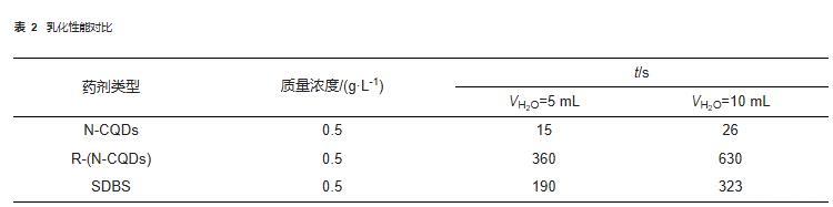 從表2可看出,R-(N-CQDs)的乳化性能遠優(yōu)于SDBS,分離出5 mL和10 mL水的時間接近SDBS的兩倍。這是由于R-(N-CQDs)是納米顆粒,吸附在界面膜附近可以大大增強界面膜的強度,從而增強了乳狀液的穩(wěn)定性。