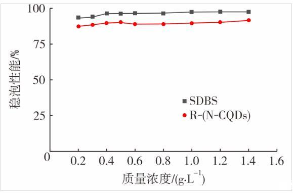 圖8是穩(wěn)泡性能測試結(jié)果。從圖8可看出,R-(N-CQDs)的穩(wěn)泡性能一直保持在95%以上,SDBS的穩(wěn)泡性能一直處于90%與95%之間。這是因為R-(N-CQDs)本身結(jié)構(gòu)的原因,碳量子點表面存在羥基、叔胺等親水基團,同時,還存在很多疏水長碳鏈,這使得R-(N-CQDs)能夠很好地吸附在氣液兩相界面(即液膜表面)上,在液膜表面形成納米粒子保護層,一方面,增加了液膜強度;另一方面,減少了泡沫的歧化現(xiàn)象,大大增加了泡沫的穩(wěn)定性。