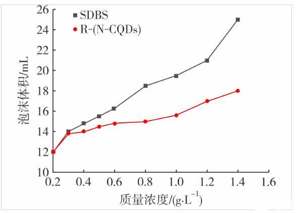 從圖7可看出,R-(N-CQDs)的起泡能力表現(xiàn)不佳,雖然在高質(zhì)量濃度下其起泡能力相比低質(zhì)量濃度時有一定的提高,但是相對于SDBS的起泡能力仍存在較大的差距,這與R-(N-CQDs)自身結(jié)構(gòu)有關(guān),SDBS是直鏈結(jié)構(gòu),而R-(N-CQDs)結(jié)構(gòu)上存在很多支鏈,形成泡沫時需要克服更多的表面能做功,所以形成的泡沫比SDBS更少。