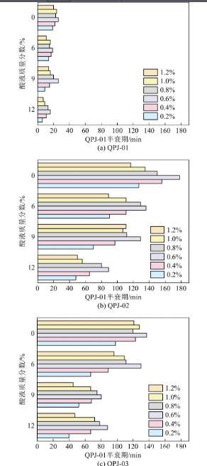 為了研究3種不同濃度起泡劑復配不同濃度酸溶液的泡沫穩(wěn)定性能,根據(jù)泡沫持續(xù)時間(半衰期)評價泡沫體系的穩(wěn)定性,如圖8所示。由圖8可知,不同起泡劑復配體系的半衰期存在顯著差異,其中QPJ-01復配溶液的泡沫半衰期明顯低于其余2種,QPJ-02泡沫半衰期更長,泡沫體系穩(wěn)定性更好。同時,酸液濃度對泡沫穩(wěn)定性起抑制作用,酸液濃度越高,泡沫衰減速度更快,清水復配3種起泡劑溶液泡沫半衰期均更長。