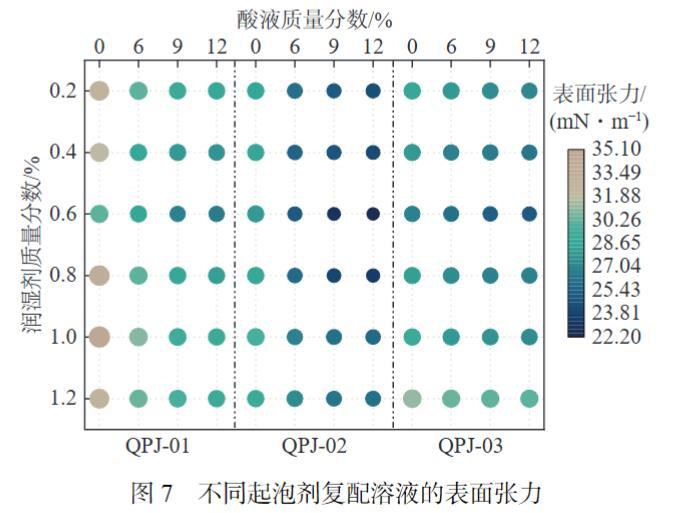 氣液界面表面張力一定程度上表征起泡性能,溶液氣液表面張力越小,分子間束縛力下降,氣泡更容易溢出,起泡性能更強。因此為了測定混合酸環(huán)境下不同起泡劑復配溶液起泡效果,選用設備為SDC-350整體傾斜型接觸角測量儀開展表面張力測試試驗。圖7為QPJ-01、QPJ-02、QPJ-03等3種不同濃度起泡劑在清水與不同濃度酸液條件下的氣液界面表面張力,由圖7可知,3種起泡劑?酸液復配溶液表面張力與起泡劑?清水溶液相比,均呈降低狀態(tài),溶液含酸較清水會顯著降低氣液界面表面張力,含酸率越高,表面張力越小,在一定程度上溶液酸度對起泡性能起促進作用。在相同起泡劑復配酸液溶液內,酸液濃度越大,氣液界面表面張力減少越緩慢,酸液越稀,表面張力下降越快。