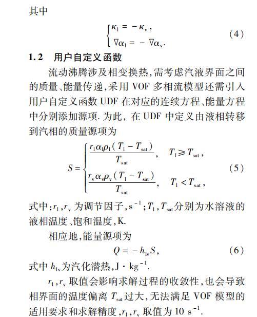 流動沸騰涉及相變換熱,需考慮汽液界面之間的質(zhì)量、能量傳遞,采用VOF多相流模型還需引入用戶自定義函數(shù)UDF在對應(yīng)的連續(xù)方程、能量方程中分別添加源項。為此,在UDF中定義由液相轉(zhuǎn)移到汽相的質(zhì)量源項為