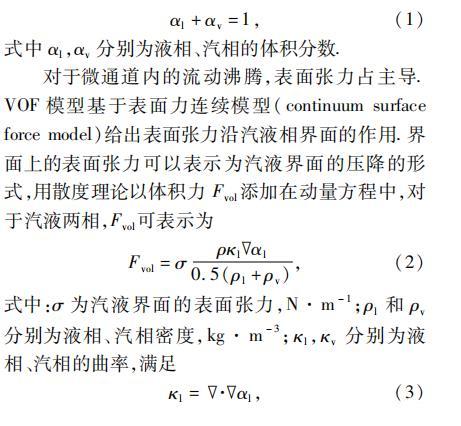 對于微通道內(nèi)的流動沸騰,表面張力占主導(dǎo)。VOF模型基于表面力連續(xù)模型(continuum surface force model)給出表面張力沿汽液相界面的作用。界面上的表面張力可以表示為汽液界面的壓降的形式,用散度理論以體積力Fvol添加在動量方程中,對于汽液兩相,F(xiàn)vol可表示為