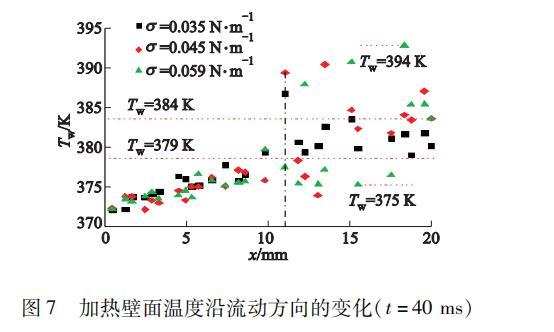圖7加熱壁面溫度沿流動(dòng)方向的變化(t=40 ms)