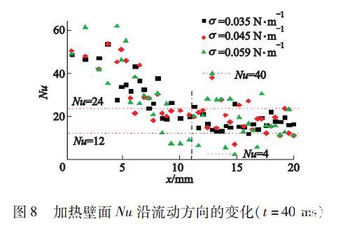 圖8加熱壁面Nu沿流動(dòng)方向的變化(t=40 ms)