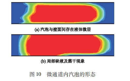 圖10a中汽泡與加熱壁面間存在一定厚度的液體微層,由壁面導(dǎo)出的熱量使微層內(nèi)的液體迅速汽化,吸收汽化潛熱,實(shí)現(xiàn)熱質(zhì)的快速遷移。因此,壁面不會(huì)出現(xiàn)局部異常過熱(圖9d中III處);圖10b則不同,汽泡與壁面間的液體微層不連續(xù),局部出現(xiàn)缺液,發(fā)生干涸,汽相充斥于壁面附近,近壁區(qū)傳熱熱阻顯著增加,導(dǎo)致壁面熱量難以轉(zhuǎn)移,壁溫迅速升高,以局部干涸點(diǎn)處的壁溫為溫度最高點(diǎn),向鄰近區(qū)域發(fā)生熱量擴(kuò)散,形成圖9d中I,II處的溫度梯度。比較發(fā)現(xiàn):相對(duì)于σ為0.059 N·m?1,σ為0.035 N·m?1時(shí)微通道內(nèi)的局部異常過熱區(qū)域減少約3/4,最高過熱溫差ΔT降低約600 K,換熱更可靠、安全。
