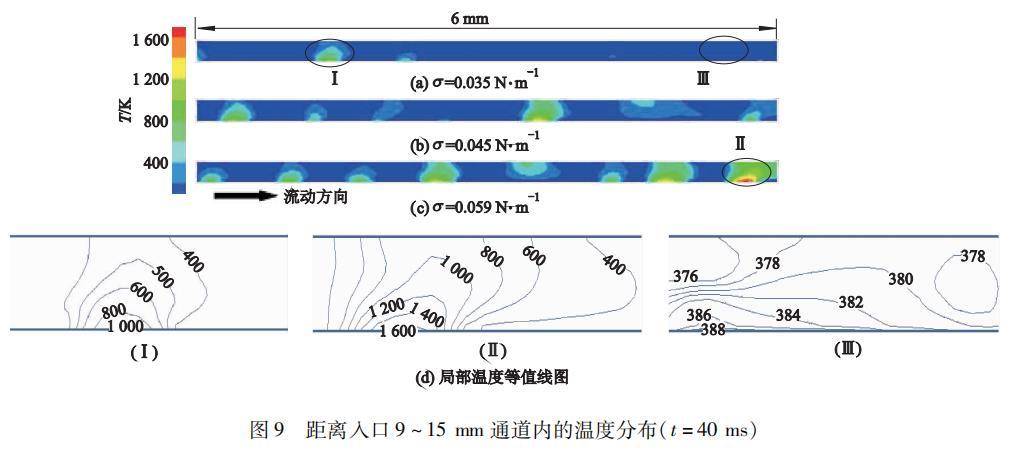 t=40 ms時(shí),距離入口9~15 mm處通道內(nèi)的溫度分布云圖如圖9所示。