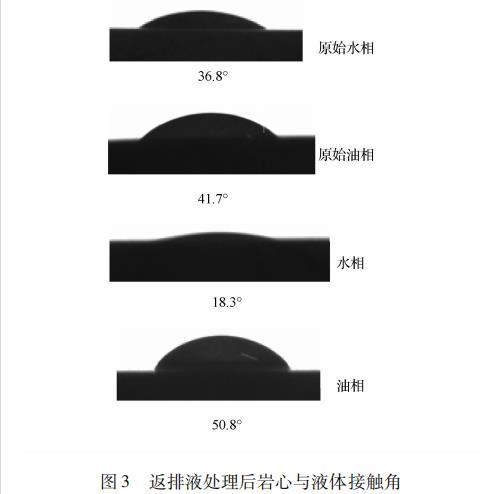 巖心原始水相、油相潤濕角均小于90°,巖石表面親水性更強(qiáng)。經(jīng)過返排液浸泡后巖石表面水相潤濕角變小,油相潤濕角變大。返排液浸泡后巖石表面水潤濕性更好,因?yàn)榉蹬乓褐泻艅┲械谋砻婊钚詣┏煞?,表面活性劑吸附于巖石表面,使巖石表面水潤濕性增強(qiáng),并影響油、水相對滲透率,能有效的提高采收率。