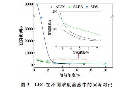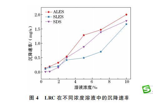 LRC在不同濃度溶液中的沉降時(shí)間和沉降速率曲線如圖3和圖4所示。由圖3可知,當(dāng)溶液濃度處于0.5‰至2‰之間時(shí),煤塵在3種溶液中的沉降時(shí)間迅速縮短;當(dāng)濃度大于2‰時(shí),煤塵沉降時(shí)間差異不大。當(dāng)CSDS≤1‰時(shí),煤塵在SDS溶液中的沉降時(shí)間大于1 h,因此,SDS在此濃度范圍內(nèi)不能快速潤(rùn)濕LRC。當(dāng)CALES和CSLES高于0.5‰時(shí),煤塵沉降時(shí)間持續(xù)緩慢縮短,該濃度范圍內(nèi)ALES、SLES溶液潤(rùn)濕煤塵的時(shí)間小于500 s。由此可知,低濃度下ALES、SLES溶液比SDS溶液更容易潤(rùn)濕LRC。由圖4可知,當(dāng)溶液濃度大于3‰時(shí),煤塵在SDS溶液中的沉降速度大于SLES溶液,拐點(diǎn)處于2‰至3‰之間。因此,當(dāng)溶液濃度小于拐點(diǎn)濃度時(shí),3種溶液潤(rùn)濕LRC的能力排序?yàn)锳LES>SLES>SDS;當(dāng)溶液濃度大于拐點(diǎn)濃度時(shí),3種溶液潤(rùn)濕LRC的能力排序?yàn)锳LES>SDS>SLES。上述分析表明,高、低濃度的ALES溶液對(duì)LRC均具有較強(qiáng)的潤(rùn)濕性。