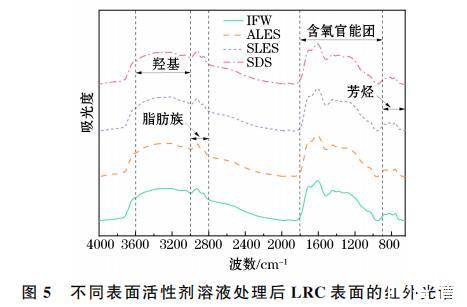 不同溶液處理后煤樣的含氧官能團(tuán)吸收帶的峰面積和官能團(tuán)占比見(jiàn)表1。由表1可知,經(jīng)IFW、ALES、SLES和SDS溶液處理后煤樣的C-O-C的峰面積分別為13.87、14.46、14.73和13.43。表明ALES、SLES在LRC表面均發(fā)生了明顯吸附。由于SDS不含烷基醚基團(tuán),經(jīng)SDS溶液處理后煤樣的烷基醚基團(tuán)所對(duì)應(yīng)的峰面積并沒(méi)有明顯增加。由于NH4+(1385~1500 cm-1)的非對(duì)稱變角振動(dòng)與-CH3、-CH2的變形振動(dòng)重合,因此將-CH3、-CH2的變形振動(dòng)對(duì)應(yīng)的峰面積進(jìn)行加和分析。經(jīng)不同溶液處理后煤樣的NH+的非對(duì)稱變角振動(dòng)的峰面積占比分別由25.6%(IFW)增加至26.7%(ALES)、25.9%(SLES)和26.8%(SDS);-CH3和-CH2所占峰面積分別由69.55(IFW)增至75.38(ALES)、71.76(SLES)和72.02(SDS)。上述分析表明,ALES在LRC表面的吸附量要明顯大于SLES和SDS在LRC表面的吸附量。