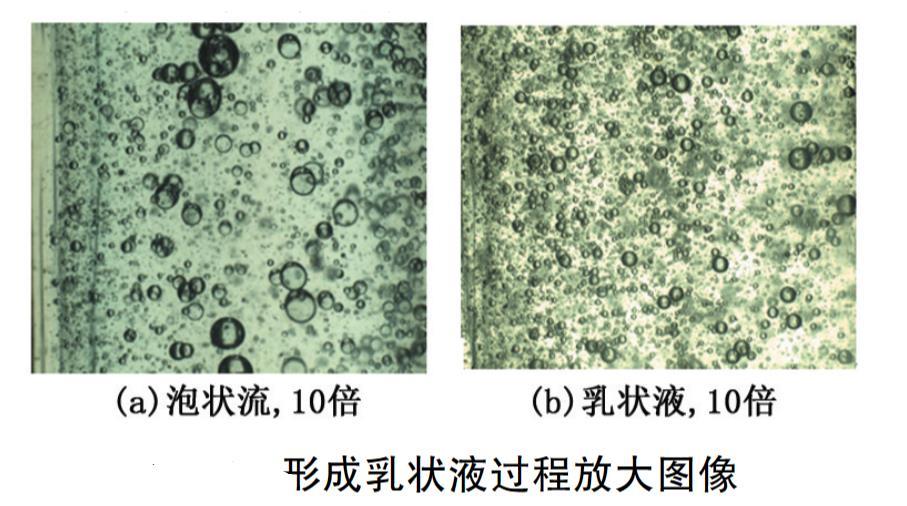 50%持水率的表面活性劑水溶液加入油相中后,先以連續(xù)的擾動流流動型態(tài)穿過油相;到2min時,連續(xù)的水相逐漸分散、溶解,油珠穿插在連續(xù)的水相中,形成更明顯的攪拌狀流動;3min時,水相繼續(xù)分散,水相與油相形成油水界面膜,此時泡狀流出現(xiàn)(水泡放大10倍圖像見圖5 (a));5min時,部分水相與油相形成水包油乳狀液,透光性變差,水相與形成的水包油乳狀液以環(huán)狀流的形式在垂直管道中上升流動;7min時,更多的水包油乳狀液形成,少部分水相分散在水包油乳狀液中;8min完全形成O/W乳狀液(10倍放大圖見圖5(b))。