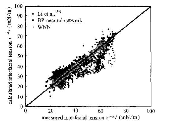 本研究創(chuàng)新性地構(gòu)建了小波神經(jīng)網(wǎng)絡(luò)模型來進(jìn)行界面張力預(yù)測。該模型本質(zhì)上是將小波分析理論與傳統(tǒng)的BP神經(jīng)網(wǎng)絡(luò)相結(jié)合。其核心優(yōu)勢在于,用具有良好局部時(shí)頻特性的小波基函數(shù)(本研究采用Morlet小波)替代了傳統(tǒng)S型函數(shù)作為隱含層的激活函數(shù)。小波基函數(shù)具有伸縮和平移的能力,能更有效地捕捉和逼近數(shù)據(jù)中不同頻率的特征,從而在理論上賦予了網(wǎng)絡(luò)更強(qiáng)的函數(shù)逼近能力和容錯(cuò)性能,有助于克服傳統(tǒng)BP神經(jīng)網(wǎng)絡(luò)易陷入局部極小值、對初始權(quán)重敏感等固有缺陷。模型的構(gòu)建與訓(xùn)練過程嚴(yán)謹(jǐn):首先將全部數(shù)據(jù)隨機(jī)劃分為訓(xùn)練集和測試集;通過試算法優(yōu)化網(wǎng)絡(luò)結(jié)構(gòu),即系統(tǒng)性地改變隱含層神經(jīng)元數(shù)量進(jìn)行多次訓(xùn)練,最終確定了輸入層6個(gè)節(jié)點(diǎn)、隱含層16個(gè)節(jié)點(diǎn)、輸出層1個(gè)節(jié)點(diǎn)(即6-16-1)的網(wǎng)絡(luò)架構(gòu)為最優(yōu),該結(jié)構(gòu)在保證精度的同時(shí)避免了過擬合。模型通過最速下降法與動(dòng)量因子結(jié)合的方法進(jìn)行迭代訓(xùn)練,不斷調(diào)整層間連接權(quán)重及小波函數(shù)的伸縮平移參數(shù),直至預(yù)測誤差最小化。