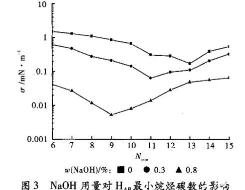 由圖3可知,隨著堿用量的增加,HAB溶液的Nmin值從13變?yōu)?,Nmin與EACN的比值從13/9變到1,即Nmin與EACN的比值更接近1,相應(yīng)的界面張力也變得更低。對于混合表面活性劑體系來說,Nmin值雖然宏觀上表現(xiàn)出一個(gè)值,而實(shí)質(zhì)上是通過組成此混合表面活性劑體系中幾種表面活性劑的Nmin值通過計(jì)算平均值得到的。實(shí)驗(yàn)中所用到的重烷基苯磺酸鈉是一種混合表面活性劑,主要是由單烷基苯磺酸鈉、二烷基苯磺酸鈉、多烷基苯磺酸鈉以及烷基萘磺酸鈉等幾種磺酸鹽表面活性劑組成的,因此可以推斷出,堿的加入改變了實(shí)驗(yàn)中表面活性劑HAB中每種表面活性劑的Nmin值,HAB溶液的Nmin值也就發(fā)生了變化,當(dāng)堿的質(zhì)量分?jǐn)?shù)為0.8%時(shí),HAB溶液的Nmin值變?yōu)?,如圖1所示,HAB溶液與直餾柴油間的界面張力達(dá)到超低。