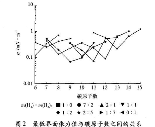 在測定直餾柴油與HA和HB的比值不同的表面活性劑體系間的界面張力時(shí)發(fā)現(xiàn),HA與HB的比值為1:2時(shí),油/水界面張力最低,因此可以判斷出直餾柴油的EACN值為9。