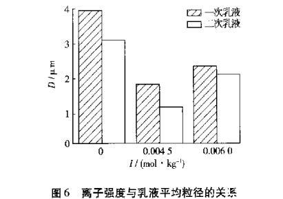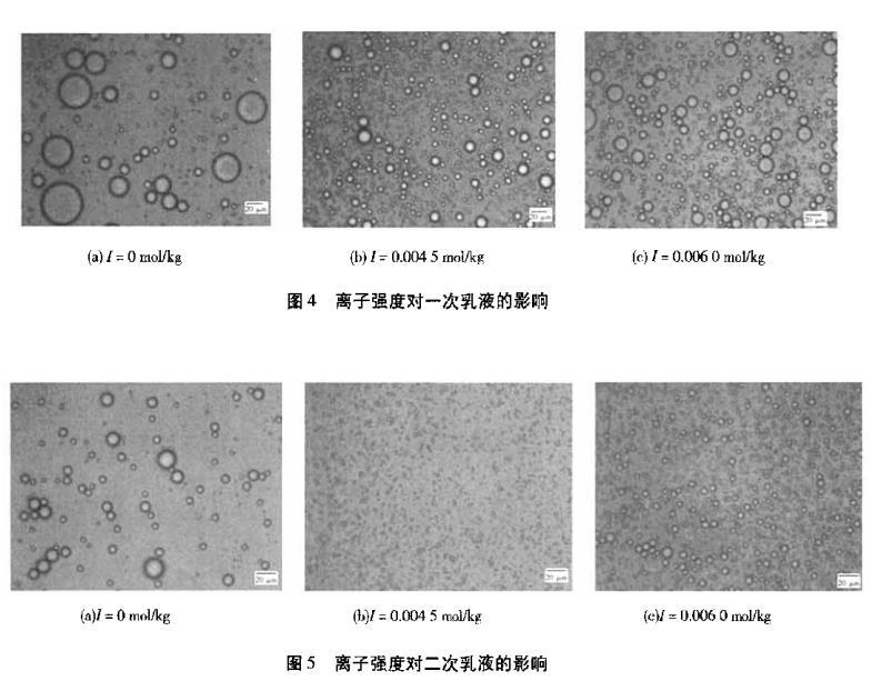 用電子顯微鏡觀察不同離子強(qiáng)度下的乳液情況。圖4為離子強(qiáng)度對一次乳液的影響,圖5為離子強(qiáng)度對二次乳液的影響。由圖4、圖5可知,在離子強(qiáng)度為0的條件下界面張力大,所以制得的乳液粒徑也較大且大小不均一。離子強(qiáng)度為0.0045 mol/kg時,界面張力最小,所以乳化效果較好,制得的乳液液滴粒徑最小,大小也比較均一。離子強(qiáng)度為0.0060 mol/kg時,隨離子強(qiáng)度的增大,界面張力先降低后又回升,所以乳液液滴也增大,而且大小沒有離子強(qiáng)度為0.0045 mol/kg時制備的乳液均一。隨離子濃度的變化,一次乳液和二次乳液粒徑的變化是相同的,如圖6所示。