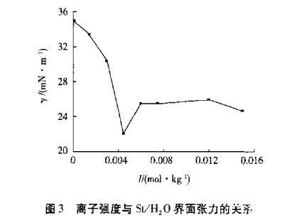 界面張力取決于界面的性質(zhì),凡能影響物質(zhì)性質(zhì)的因素,對界面張力均有影響。本實(shí)驗(yàn)在水中添加了Na2SO4,改變其離子強(qiáng)度,電荷在St/H2O界面層相互作用對界面張力產(chǎn)生影響。根據(jù)下式計(jì)算本實(shí)驗(yàn)體系的離子強(qiáng)度(I)。
