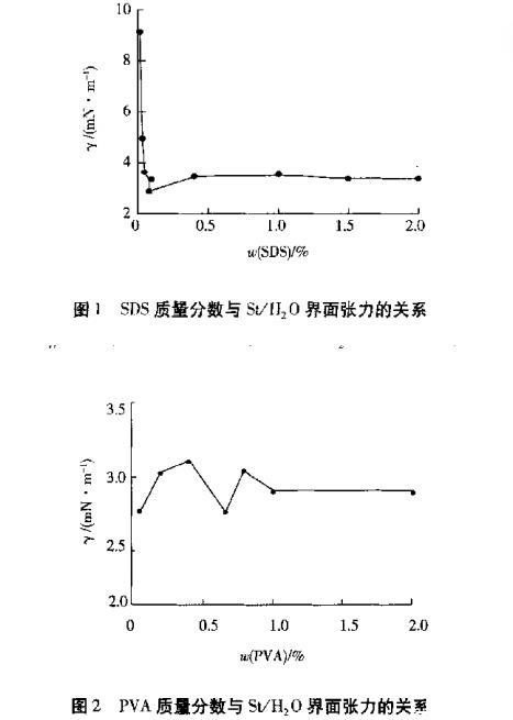 由圖1可以看出,隨著SDS濃度的增加,苯乙烯與SDS水溶液的界面張力先迅速下降,再略有上升,后基本保持平衡。當(dāng)活性劑在溶液中的濃度達(dá)到一定值以后,如果其濃度進(jìn)一步增加,整個體系的能量達(dá)到最低,此時活性劑分子中的長鏈親油基締合在一起,形成膠束,而膠束的存在破壞了油水界面的混合界面膜,因此溶液界面張力又略有回升。SDS的臨界膠束質(zhì)量分?jǐn)?shù)為0.086%。由圖1也可以得知,對于本實(shí)驗(yàn)體系SDS的最佳質(zhì)量分?jǐn)?shù)為0.065%。由圖2可以看出,PVA濃度對界面張力的影響不大,作為穩(wěn)定劑,起到一定助乳化劑的功能。