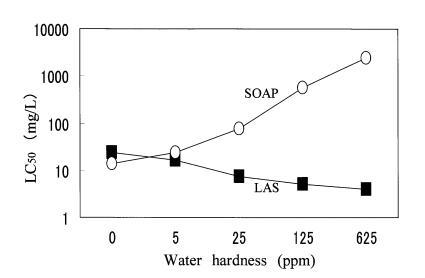 在預(yù)試驗(yàn)中,大型水蚤在4鹽混合溶液中存活,但在CaCl2?H2O溶液或蒸餾水中不能存活。 另一方面,角鯊在所有3種水中都能存活。 因此,使用podocopida研究了水硬度成分對(duì)LAS和肥皂毒性的影響。 如圖3所示,CaCl2?H2O溶液和4-鹽混合溶液的毒性值沒(méi)有差異。 肥皂的毒性隨水硬度的增加而降低,LAS的毒性隨水硬度的增加而增加。