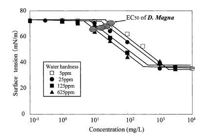 圖9水硬度對(duì)烷基硫酸鹽表面張力曲線的影響以及對(duì)大型水蚤的有毒表面張力值。