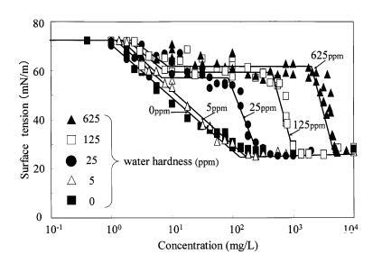圖7水硬度對(duì)肥皂表面張力曲線的影響。