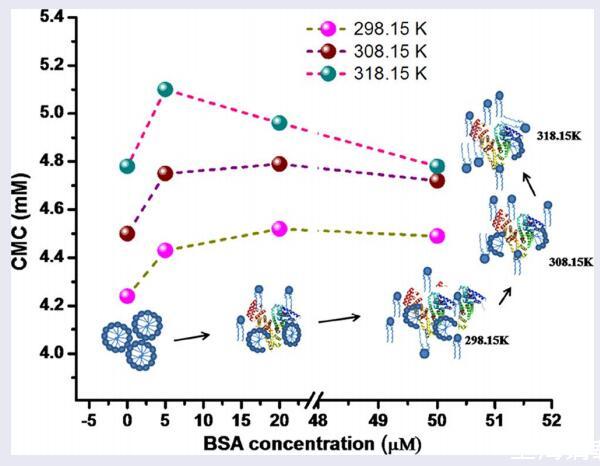 用表面張力法研究了牛血清白蛋白對IL型gemini表面活性劑[C10-4-C10im]Br2表面性質的影響。研究了不同溫度下臨界膠束濃度(CMC)與BSA濃度的關系。[C10-4-C10im]Br2的CMC隨著BSA濃度的增加以及系統(tǒng)溫度的升高而增加。界面參數,即;計算了最大表面過量濃度(Γmax)、每分子最小面積(Amin)和CMC下的表面壓力(ΔCMC)。此外,利用表面張力數據評估了吸附和膠束化的熱力學參數。結果表明,[C10-4-C10im]Br2與BSA的結合是自發(fā)的、放熱的。該過程是熵驅動的,疏水相互作用是主要驅動力。