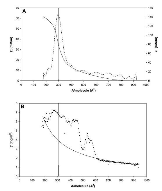 圖3 HFBII的代表性壓縮等溫線,壓縮量遠(yuǎn)低于每個分子的面積。 (A) P(-)和E(---)與每個分子的面積的關(guān)系。 (B) 攤鋪量和壓縮(Gcomp,-)預(yù)期的表面載荷,并通過橢偏儀(Gell,A)測量。