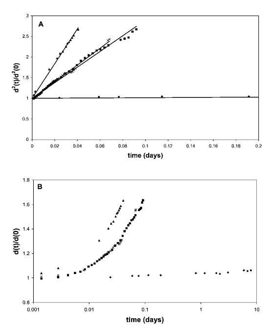 圖1面板A顯示了黃原膠溶液中50 vol%氣泡的相對平方氣泡直徑d2(t)/d2(0)。 泡沫由含有0.1 wt%HFBII(A)、0.5 wt%b-lg(-)、0.1 wt%b-酪蛋白(:)和0.1 wt%Quillaja皂甙(*)的水溶液生成。 將所得泡沫轉(zhuǎn)移到0.5 wt%黃原膠溶液中。 面板B以對數(shù)時間刻度顯示整個時間間隔內(nèi)的數(shù)據(jù)。