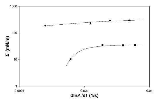 頻率依賴性。 為了評估其中一些系統(tǒng)中粘性損失的重要性,我們對b-lg和HFBII進(jìn)行了頻率相關(guān)的表面膨脹流變。 對于表面膨脹流變學(xué),我們顯示了在18<P<22 mN m-1之間測量的小變形模量(見圖10)。 注意,變形率d(lna)/dt為0.0012 s 1對應(yīng)于5 mm min 1的勢壘速度,用于大變形實驗。 相比之下,歧化時間約為0.5小時,接近泡沫實驗觀察到的粗化時間。 HFBII的數(shù)據(jù)表明,在所研究的變形速率范圍內(nèi),變形速率對E的影響適中。 對于b-乳球蛋白,頻率的影響更為明顯,因此,在變形速率低于0.001 s 1時,可觀察到E的強(qiáng)烈下降。 這表明b-lg的粘性損失比HFBII更為明顯。 這一比較再次表明,b-lg的外觀更柔軟,壓縮/膨脹時解吸/吸附能力更強(qiáng)。