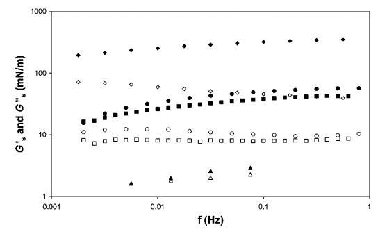 表面剪切流變學(xué)。 所有四個系統(tǒng)的表面剪切流變測量如圖11所示。 我們觀察到HFBII具有模量,比b-乳球蛋白和皂甙高一個數(shù)量級,這與早期結(jié)果一致。25值得一提的是,對于像奎拉葉皂甙這樣的表面活性劑,測得的表面剪切彈性非常高。 b-酪蛋白的表面剪切模量要低一個數(shù)量級。 關(guān)于頻率,我們發(fā)現(xiàn)與HFBII相比,皂甙和b-乳球蛋白對頻率的依賴性更強(qiáng),尤其是在低頻率下。 此外,對于HFBII而言,Gs 00/Gs0的比率是最低的,即表面彈性對模量的貢獻(xiàn)比表面粘度大得多。 當(dāng)我們向交叉點外推時,我們預(yù)計HFBII和b-乳球蛋白或皂甙之間的弛豫時間會有一個數(shù)量級的差異。 對于b-酪蛋白,從0.01 Hz左右的數(shù)據(jù)可以很容易地觀察到交叉點。