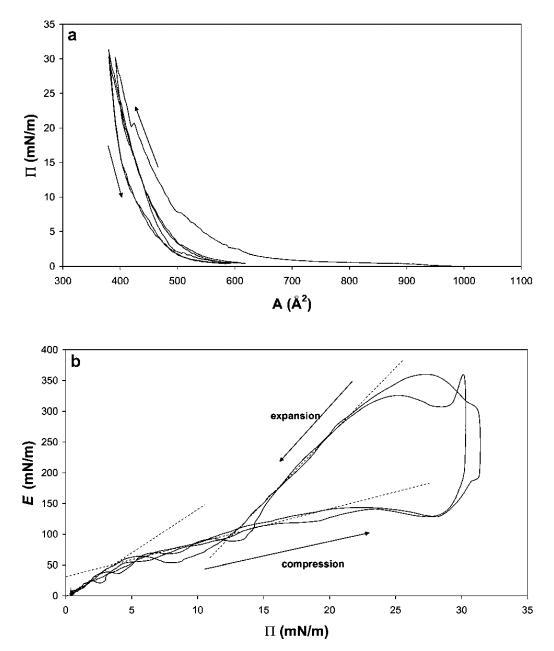 b-乳球蛋白。圖7顯示了b-乳球蛋白的壓縮等溫線。這條曲線遠(yuǎn)沒有HFBII曲線陡峭,拐點更為明顯。盡管在屏障運(yùn)動逆轉(zhuǎn)時觀察到滯后現(xiàn)象。E–P曲線的初始斜率為4.3,遠(yuǎn)小于低P區(qū)的HFBII,表明b-lg分子在界面中相對較軟。觀察到E的平滑最大值為43 mN m-1,之后在進(jìn)一步壓縮至28 mN m-1時,不再檢測到E的恢復(fù)。結(jié)果與早期的研究結(jié)果一致。40,41在屏障逆轉(zhuǎn)時,觀察到E的超調(diào),再次表明結(jié)構(gòu)無法適應(yīng)突然膨脹和斷裂。