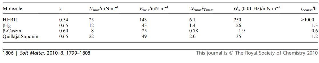 當(dāng)我們現(xiàn)在再次考慮表1中的2Emax/gmax比率時,很明顯HFBII超過了5的值,這表明這將穩(wěn)定泡沫,防止收縮。 根據(jù)Kloek等人的說法,對于b-乳球蛋白和皂甙,我們報告的值介于1和2之間,表明氣泡收縮延遲,但沒有完全停止。2食品蛋白質(zhì)通常屬于這種狀態(tài),對歧化過程的抵抗力相對較小。10最后, 根據(jù)這個比率,b-酪蛋白根本無法抵消氣泡收縮,因為2Emax/gmax<1,這是主要的吉布斯標(biāo)準(zhǔn)。