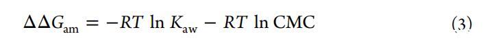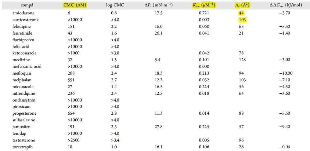 式中,π對(duì)應(yīng)于表面壓力,C對(duì)應(yīng)于化合物濃度。(ii)CMC:對(duì)應(yīng)于最大表面壓力下平臺(tái)截距和曲線外推斜率的臨界膠束濃度(?π/?lnc)處于拐點(diǎn)(圖3)。(iii)ΔΔGam:式3中的兩親性