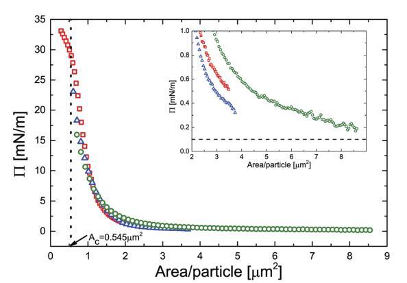 壓力-面積等溫線(xiàn)是通過(guò)在Langmuir槽上對(duì)擴(kuò)散單分子膜進(jìn)行3組不同實(shí)驗(yàn)得到的。這些等溫線(xiàn)中的面積坐標(biāo)根據(jù)吸附在界面上的顆粒數(shù)量進(jìn)行縮放。如圖1所示,所有曲線(xiàn)都折疊到一個(gè)圖上。在增加壓縮時(shí),壓力最初略有變化,但低于2 mm2/顆粒時(shí),壓力急劇增加。曲線(xiàn)的斜率首先增加,但在約27 mN m-1處達(dá)到最大值,在此有一個(gè)拐點(diǎn),然后是一個(gè)稍弱的斜率。如圖1中的虛線(xiàn)所示,對(duì)應(yīng)于該拐點(diǎn)的每粒子面積(Ac)值為0.545 mm2。假設(shè)粒子緊密堆積,這對(duì)應(yīng)于~835 nm的粒子間距離,遠(yuǎn)大于在本體溶液中測(cè)量的粒子流體動(dòng)力學(xué)直徑(590 nm),表明粒子確實(shí)發(fā)生了實(shí)質(zhì)性變形。如圖1的插圖所示,0.5 mN m-1級(jí)的有限表面壓力(即遠(yuǎn)高于我們的檢測(cè)極限0.1 mN m-1)實(shí)際上已經(jīng)可以在約4 mm2的每粒子面積上測(cè)量。插圖還表明,在兩個(gè)不同的朗繆爾槽上進(jìn)行的不同實(shí)驗(yàn)之間,P的絕對(duì)值在0.3 mN m-1范圍內(nèi)可重復(fù)。