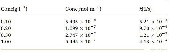 表2根據(jù)圖6中的實(shí)驗(yàn)曲線(xiàn)計(jì)算的各種濃度的速率常數(shù)k(1/s)值