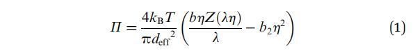 吸附在流體-流體界面上的顆粒相互作用并產(chǎn)生表面壓力(P),這是3D系統(tǒng)中壓力的2D模擬。通過(guò)進(jìn)一步擴(kuò)展這種類(lèi)比,還可以通過(guò)狀態(tài)方程將表面壓力與其他狀態(tài)參數(shù)(如數(shù)密度和溫度)聯(lián)系起來(lái)。對(duì)于吸附在流體-流體界面上的膠體粒子,最簡(jiǎn)單的近似可能是2D硬盤(pán)。單組分系統(tǒng)的狀態(tài)方程(EOS)是根據(jù)壓縮因子Z的密度依賴(lài)性給出的。文獻(xiàn)中充滿(mǎn)了多種方法來(lái)提供2D硬盤(pán)流體狀態(tài)方程的表達(dá)式。Mulero等人27,28簡(jiǎn)要回顧和比較了所有這些狀態(tài)方程。