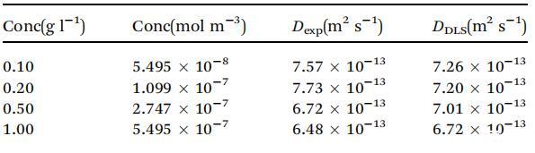 表1根據(jù)實(shí)驗(yàn)G與t1/2曲線(xiàn)計(jì)算的不同濃度的擴(kuò)散系數(shù)D(m2 s-1)值與使用DLS測(cè)量的值相比