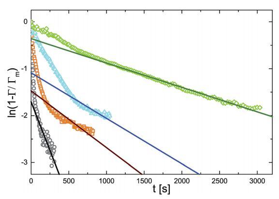 在建立了一個(gè)狀態(tài)方程來(lái)關(guān)聯(lián)表面壓力和吸附量之后,我們現(xiàn)在開(kāi)始研究粒子的吸附動(dòng)力學(xué)。為此,我們監(jiān)測(cè)了PNIPAM顆粒懸浮液中新制備氣泡的界面張力隨時(shí)間的變化。我們將界面張力值轉(zhuǎn)換為表面壓力。結(jié)果如圖4所示。表面壓力值最初迅速增加,然后放松到最終平衡值。動(dòng)力學(xué)可以清楚地分為兩個(gè)獨(dú)立的時(shí)間尺度:一個(gè)是表面壓力值增加表示的初始快速動(dòng)力學(xué),另一個(gè)是系統(tǒng)向最終平衡狀態(tài)松弛時(shí)的緩慢部分。短時(shí)間快速動(dòng)力學(xué)和長(zhǎng)時(shí)間慢得多動(dòng)力學(xué)之間的區(qū)別是許多表面活性材料吸附行為的特征。32,33