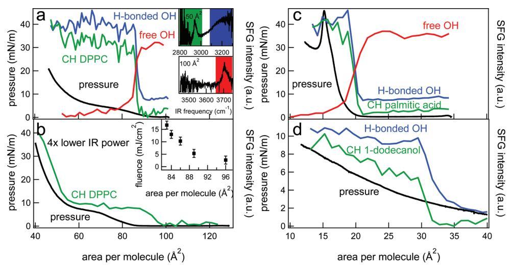 圖2。(a)DPPC的CH信號(綠色)、氫鍵OH信號(藍色)和自由OH信號(紅色)的表面壓力(黑色,左軸)和積分SFG強度(右軸),作為連續(xù)壓縮單層過程中每個分子面積的函數(shù)。為了清晰起見,集成SFG信號被歸一化,并且彼此之間具有小偏移。集成光譜區(qū)域由插圖中的彩色正方形標記,分別顯示CH/OH鍵合和游離OH區(qū)域中每個分子50和100?2的SFG光譜。相對較高的紅外通量(~已使用10 mJ/cm2)。(b)與(a)類似,但紅外功率降低了四倍,導致通量降低了四倍(~2.5 mJ/cm2)。插圖顯示了改變紅外注量對SFG信號出現(xiàn)的每個分子面積的影響。(c)類似于(a),但適用于棕櫚酸。(d)類似于(a),但對于1-十二醇。在這種情況下,未測量1-十二醇的游離OH。SFG結(jié)果是在SSP極化下獲得的。