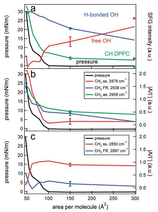 SFG光譜中不同振動的積分SFG強度與圖6a中的表面壓力一起繪制,作為每個分子面積的函數(shù)。CH強度隨著表面DPPC分子數(shù)量的增加而非線性增加。水信號持續(xù)增加,而自由OH信號隨著表面分子數(shù)量的增加而持續(xù)減少,正如預(yù)期的那樣,當系統(tǒng)達到液體膨脹相時,27達到零值。原則上,在氣相和液相膨脹相的共存區(qū)(如上~每個分子100?2),人們可能會看到波動的SFG信號,因為氣相不發(fā)出信號,而液相膨脹相發(fā)出信號。用二次諧波發(fā)生器28和橢偏儀觀察到了這種波動信號。29然而,此處未觀察到這些波動,因為呈現(xiàn)的SFG光譜平均超過10分鐘,這在磁疇擴散的時間尺度上很長,發(fā)生在數(shù)十秒的時間尺度上。28,29