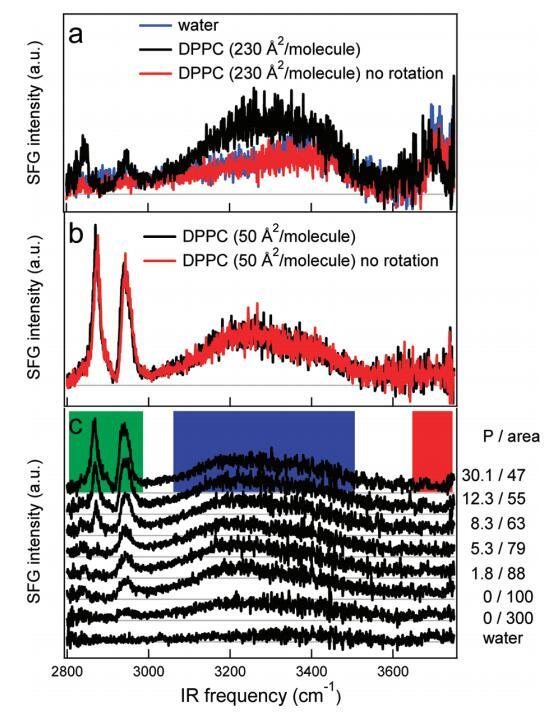 圖5。(a)DPPC在水上以230?2/分子(黑色)和不旋轉(zhuǎn)(紅色)槽的SSP極化的SFG光譜。樣品以這樣的方式旋轉(zhuǎn):在激光焦點處,樣品以~0.06 m/s。不旋轉(zhuǎn)時,光譜與水相同?空中接口(藍色)。(b)在高密度(每個分子50?2)下,旋轉(zhuǎn)(黑色)和非旋轉(zhuǎn)(紅色)之間沒有區(qū)別。(c)裸露水面的SFG光譜(SSP極化)(底部光譜)和密度增加的水中DPPC的SFG光譜。壓力(mN/m)和每個分子的面積(?2)分別從底部到頂部增加和減少,在圖表旁邊給出。每個分子的面積由氯仿溶液滴的數(shù)量控制。彩色方塊標記了圖6中使用的積分區(qū)域。本實驗中使用了相對較低的紅外注量(1.5 mJ/cm2)。